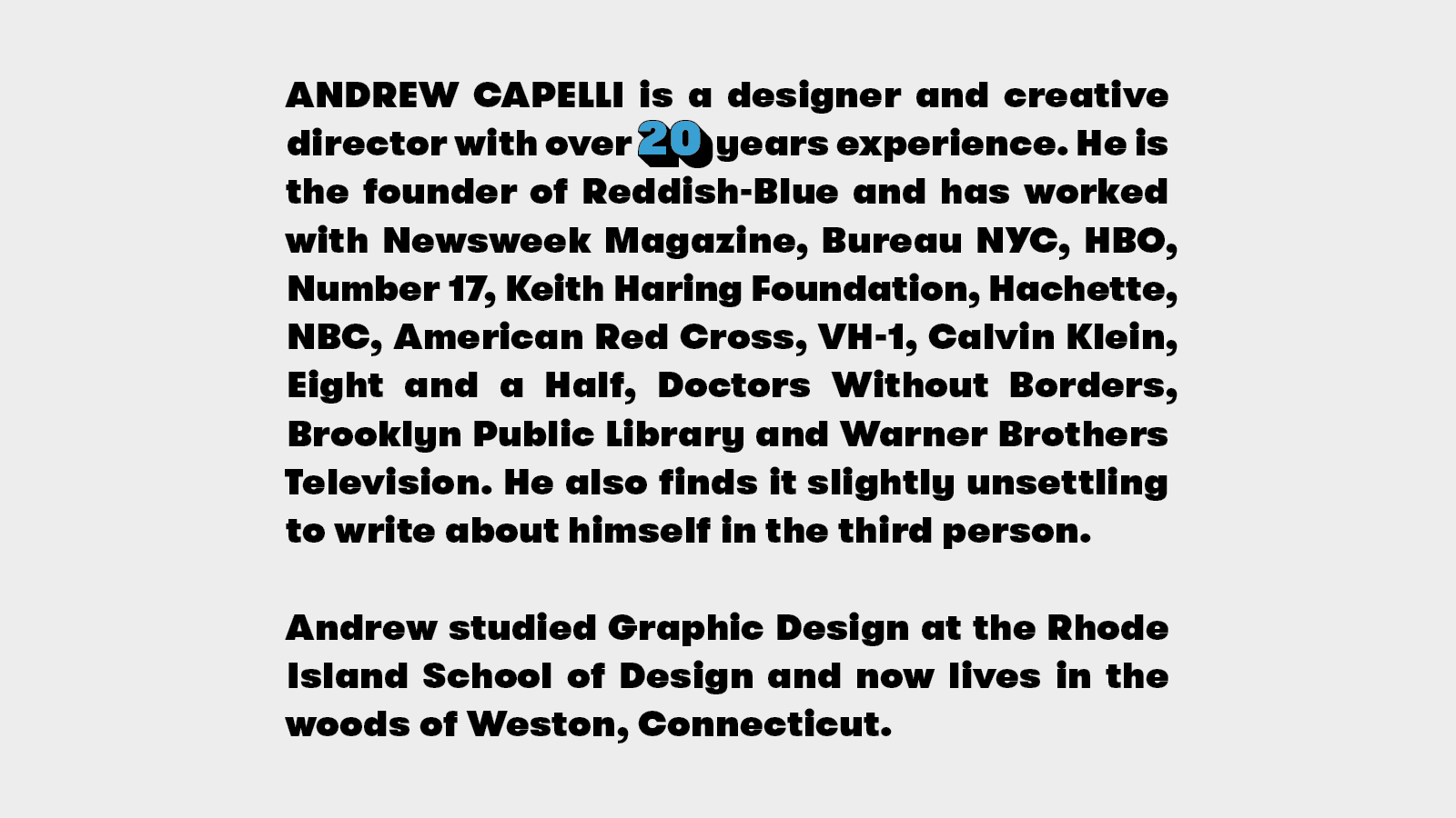 Andrew Capelli is a designer and creative director with over 20 years experience. He is the founder of Reddish-Blue and has worked with Newsweek Magazine, Bureau NYC, HBO, Number 17, Keith Haring Foundation, Hachette, NBC, American Red Cross, VH-1, Calvin Klein, Eight and a Half, Doctors Without Borders, Brooklyn Public Library and Warner Brothers Television. Work
